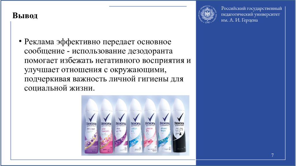 7 Реклама эффективно передает основное сообщение - использование дезодоранта помогает избежать негативного восприятия и улучшает отношения с окружающими, подчеркивая важность личной гигиены для социальной жизни.