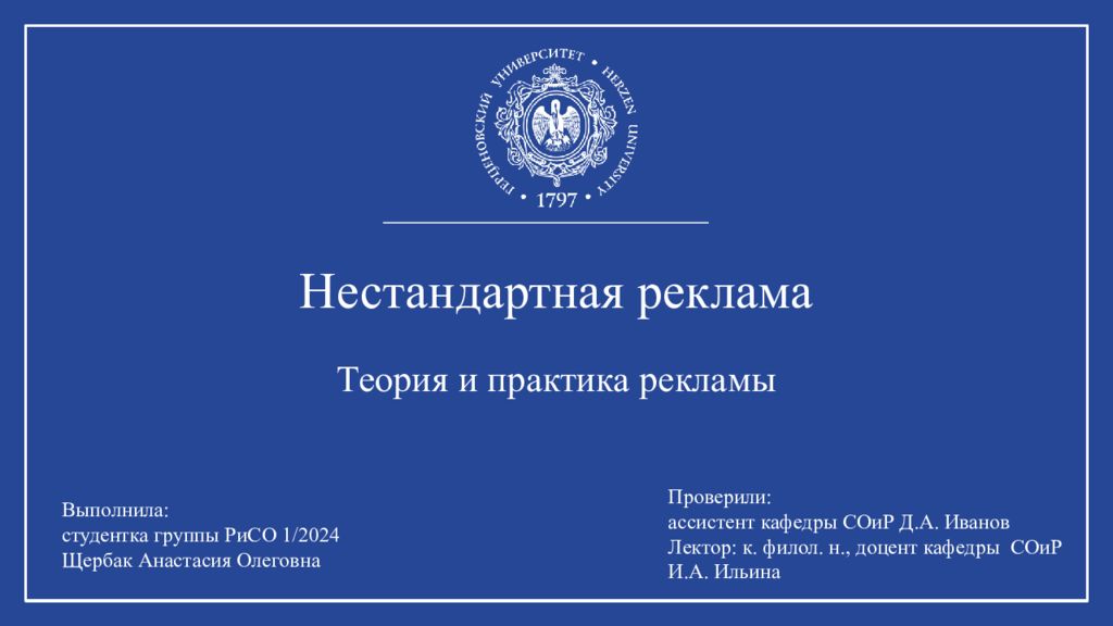 Выполнила: студентка группы РиСО 1/2024 Щербак Анастасия Олеговна Проверили: ассистент кафедры СОиР Д.А. Иванов Лектор: к. филол. н., доцент кафедры СОиР И.А. Ильина Нестандартная реклама Теория и практика рекламы