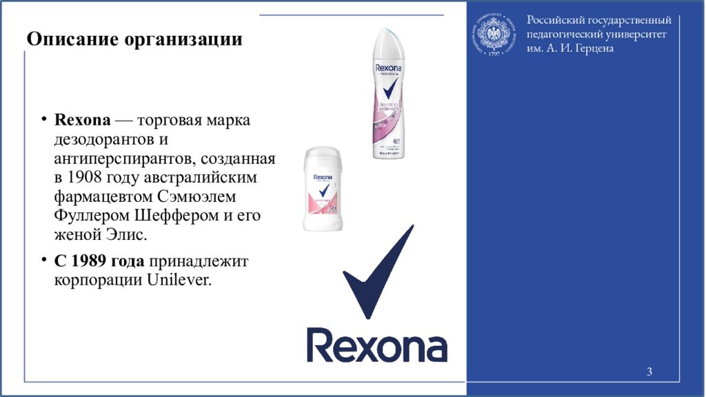 Rexona — торговая марка дезодорантов и антиперспирантов, созданная в 1908 году австралийским фармацевтом Сэмюэлем Фуллером Шеффером и его женой Элис. С 1989 года принадлежит корпорации Unilever. 3