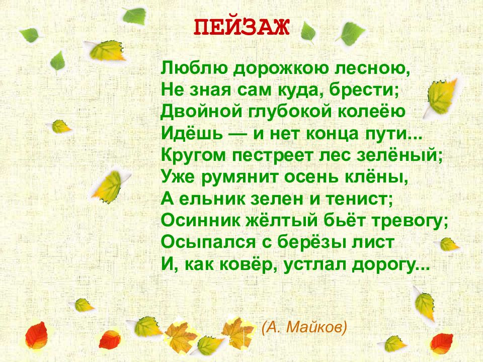 Люблю дорожкою лесною, Не зная сам куда, брести; Двойной глубокой колеёю Идёшь — и нет конца пути... Кругом пестреет лес зелёный; Уже румянит осень клёны, А ельник зелен и тенист; Осинник жёлтый бьёт тревогу; Осыпался с берёзы лист И, как ковёр, устлал дорогу... (А. Майков)