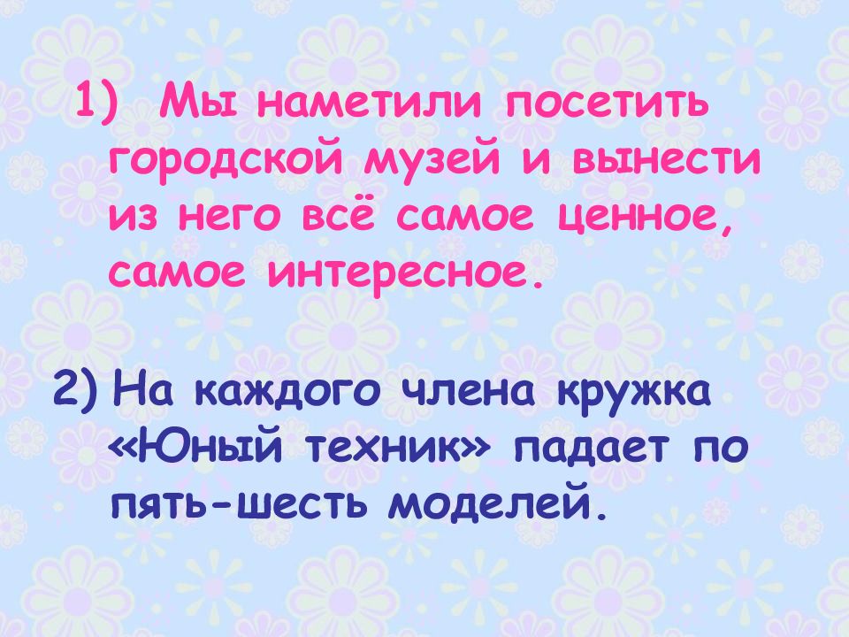 1) Мы наметили посетить городской музей и вынести из него всё самое ценное, самое интересное. 2) На каждого члена кружка «Юный техник» падает по пять-шесть моделей.