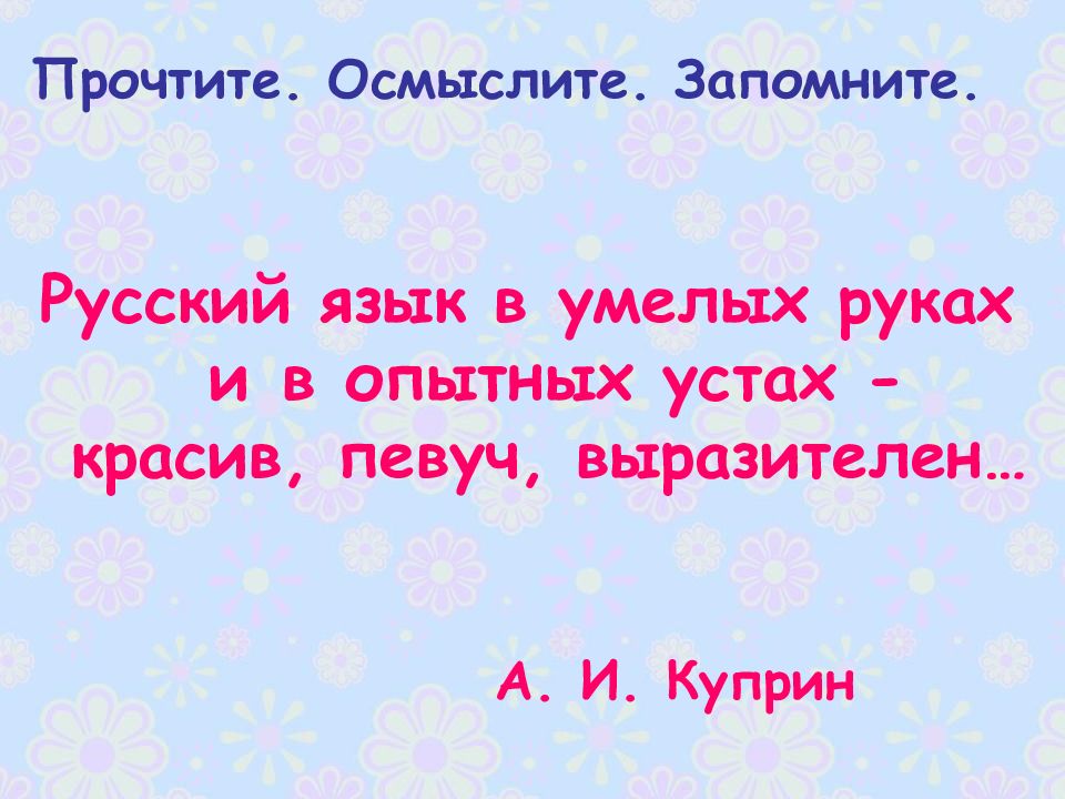 Русский язык в умелых руках и в опытных устах - красив, певуч, выразителен… А. И. Куприн Прочтите. Осмыслите. Запомните.