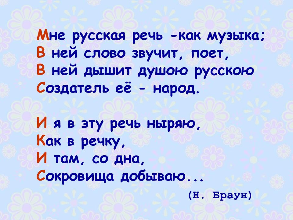 М не русская речь -как музыка; В ней слово звучит, поет, В ней дышит душою русскою С оздатель её - народ. И я в эту речь ныряю, К ак в речку, И там, со дна, С окровища добываю... (Н. Браун)