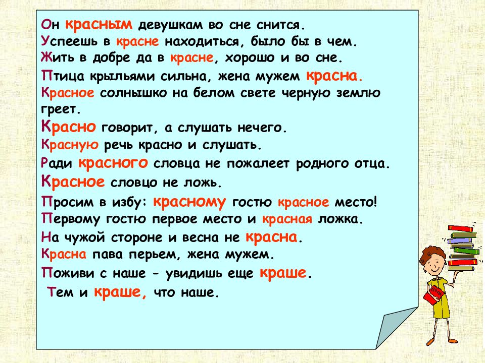 О н красным девушкам во сне снится. У спеешь в красне находиться, было бы в чем. Ж ить в добре да в красне, хорошо и во сне. П тица крыльями сильна, жена мужем красна. К расное солнышко на белом свете черную землю греет. К расно говорит, а слушать нечего. К расную речь красно и слушать. Р ади красного словца не пожалеет родного отца. К расное словцо не ложь. П росим в избу: красному гостю красное место! П ервому гостю первое место и красная ложка. Н а чужой стороне и весна не красна. К расна пава перьем, жена мужем. П оживи с наше - увидишь еще краше. Т ем и краше, что наше.
