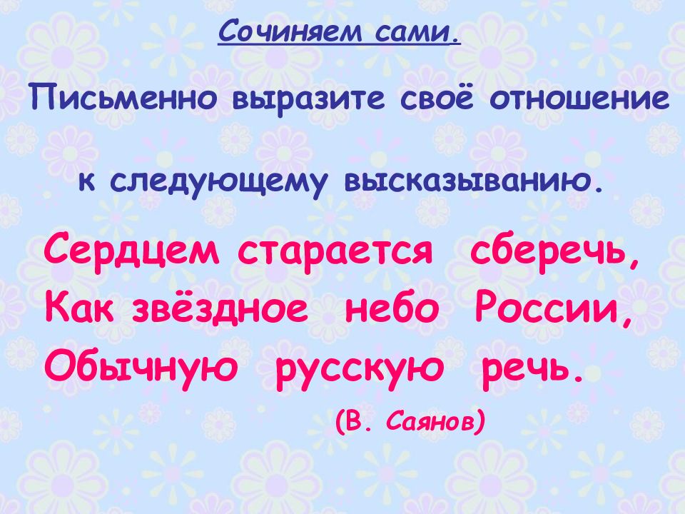Слайд 21: Сочиняем сами. Письменно выразите своё отношение к следующему высказыванию
