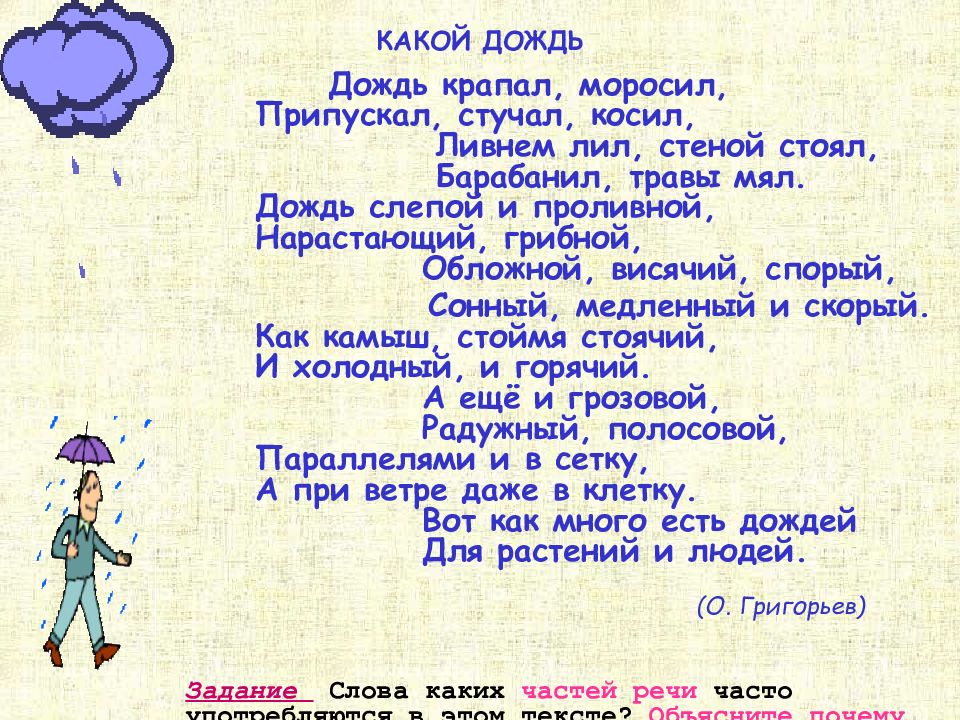 Дождь крапал, моросил, Припускал, стучал, косил, Ливнем лил, стеной стоял, Барабанил, травы мял. Дождь слепой и проливной, Нарастающий, грибной, Обложной, висячий, спорый, Сонный, медленный и скорый. Как камыш, стоймя стоячий, И холодный, и горячий. А ещё и грозовой, Радужный, полосовой, Параллелями и в сетку, А при ветре даже в клетку. Вот как много есть дождей Для растений и людей. (О. Григорьев) Задание Слова каких частей речи часто употребляются в этом тексте? Объясните почему.
