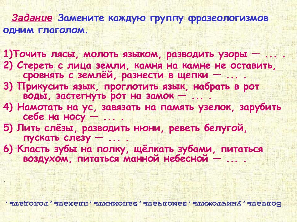 1)Точить лясы, молоть языком, разводить узоры —.... 2) Стереть с лица земли, камня на камне не оставить, сровнять с землёй, разнести в щепки —.... 3) Прикусить язык, проглотить язык, набрать в рот воды, застегнуть рот на замок —.... 4) Намотать на ус, завязать на память узелок, зарубить себе на носу —.... 5) Лить слёзы, разводить нюни, реветь белугой, пускать слезу —.... 6) Класть зубы на полку, щёлкать зубами, питаться воздухом, питаться манной небесной —.... . Болтать,уничтожить,замолчать,запомнить,плакать,голодать.