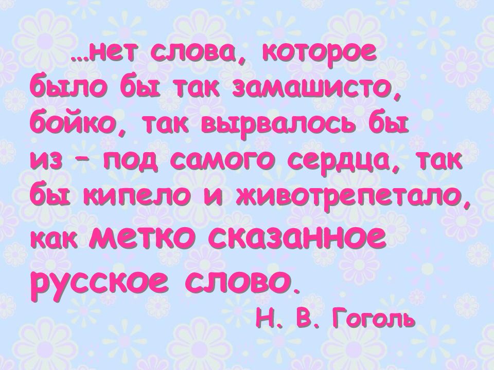 …нет слова, которое было бы так замашисто, бойко, так вырвалось бы из – под самого сердца, так бы кипело и животрепетало, как метко сказанное русское слово. Н. В. Гоголь