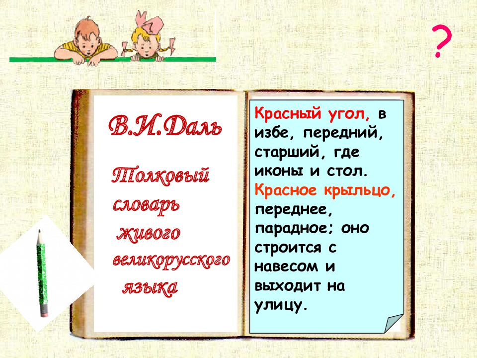 В.И.Д аль Толковый словарь живого великорусского языка Красная пора, житье- раздолье, избыток, довольство. Красная изба- чистая, белая,т.е. с трубой, с изразчатою печью и красными, косящатыми (не волоковыми) окнами и рамами. Красный молодец, девица- красавец, Красавица. Красный поезд- веселый, княжий, свадебный поезд. день. Красное словцо- острота, острая шутка. Красная строка, вся прописная, заголовок, или новая, от строки. Красный угол, в избе, передний, старший, где иконы и стол. Красное крыльцо, переднее, парадное; оно строится с навесом и выходит на улицу. ?