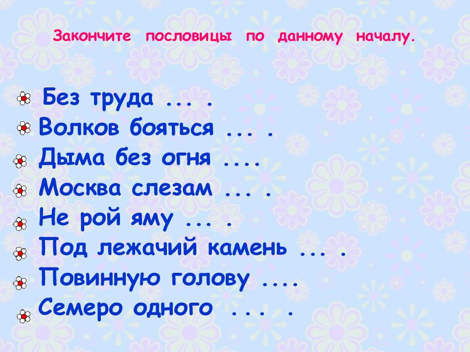 Без труда.... Волков бояться.... Дыма без огня.... Москва слезам.... Не рой яму.... Под лежачий камень.... Повинную голову.... Семеро одного....