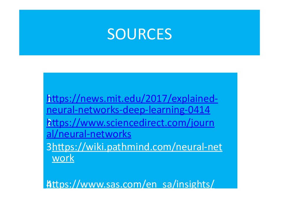 https://news.mit.edu/2017/explained-neural-networks-deep-learning-0414 https://www.sciencedirect.com/journal/neural-networks https://wiki.pathmind.com/neural-network https://www.sas.com/en_sa/insights/analytics/neural-networks.html