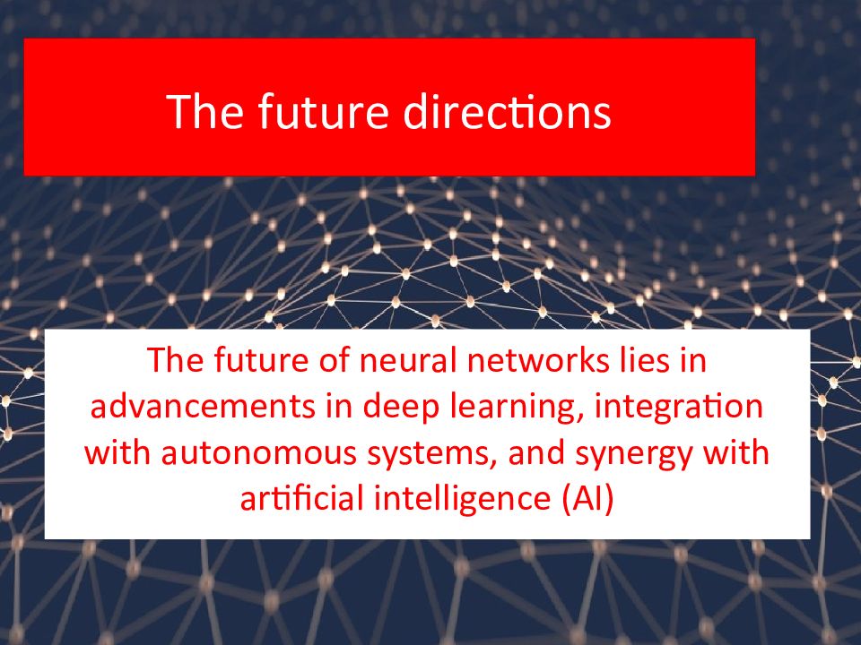 The future of neural networks lies in advancements in deep learning, integration with autonomous systems, and synergy with artificial intelligence ( AI)