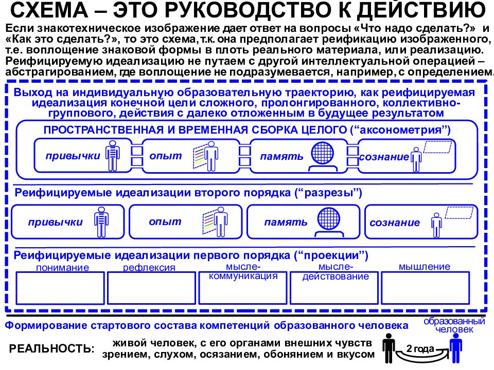 Если знакотехническое изображение дает ответ на вопросы « Что надо сделать ?» и «Как это сделать?», то это схема, т.е. воплощение знаковой формы в плоть реального материала, или реализацию. Реифицируемую идеализацию не путаем с другой интеллектуальной операцией – абстрагированием, где воплощение не подразумевается, например, с определением. живой человек, с его органами внешних чувств зрением, слухом, осязанием, обонянием и вкусом Р еифицируемые идеализации первого порядка ( “ проекции ” ) мышление Реифицируемые идеализации второго порядка ( “ разрезы ” ) привычки РЕАЛЬНОСТЬ: Выход на индивидуальную образовательную траекторию, как реифицируемая идеализация конечной цели сложного, пролонгированного, коллективно- группового, действия с далеко отложенным в будущее результатом понимание рефлексия ПРОСТРАНСТВЕННАЯ И ВРЕМЕННАЯ СБОРКА ЦЕЛОГО ( “ аксонометрия ” ) образованный человек мысле - коммуникация мысле - действование т.к. она предполагает реификацию изображенного, опыт память сознание сознание память опыт привычки Формирование стартового состава компетенций образованного человека 2 года