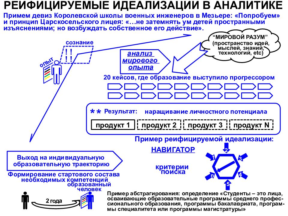 Примем девиз Королевской школы военных инженеров в Мезьере : «Попробуем » и принцип Царскосельского лицея: «…не затемнять ум детей пространными изъяснениями ; но возбуждать собственное его действие ». “ МИРОВОЙ РАЗУМ ” (пространство идей, мыслей, знаний, технологий, etc ) Выход на индивидуальную образовательную траекторию образованный человек Формирование стартового состава необходимых компетенций 2 года продукт 2 продукт 3 продукт N сознание опыт * Результат: формирование личностного потенциала продукт 1 20 кейсов, где образование выступило прогрессором анализ мирового опыта ! ! ! ! Пример реифицируемой идеализации: критерии поиска 2 3 1 n 4 5 НАВИГАТОР наращивание личностного потенциала * Пример абстрагирования: определение «Студенты – это лица, осваивающие образовательные программы среднего профес - сионального образования, программы бакалавриата, програм - мы специалитета или программы магистратуры»