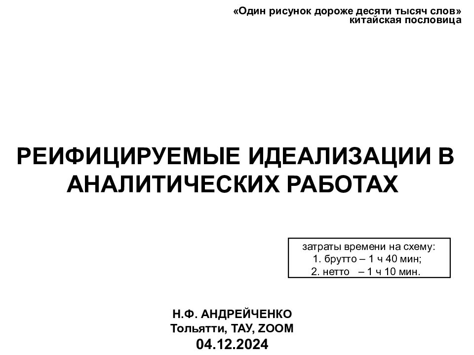 Н.Ф. АНДРЕЙЧЕНКО Тольятти, ТАУ, ZOOM 04.12.2024 «Один рисунок дороже десяти тысяч слов» китайская пословица РЕИФИЦИРУЕМЫЕ ИДЕАЛИЗАЦИИ В АНАЛИТИЧЕСКИХ РАБОТАХ затраты времени на схему: 1. брутто – 1 ч 40 мин; 2. нетто – 1 ч 10 мин.