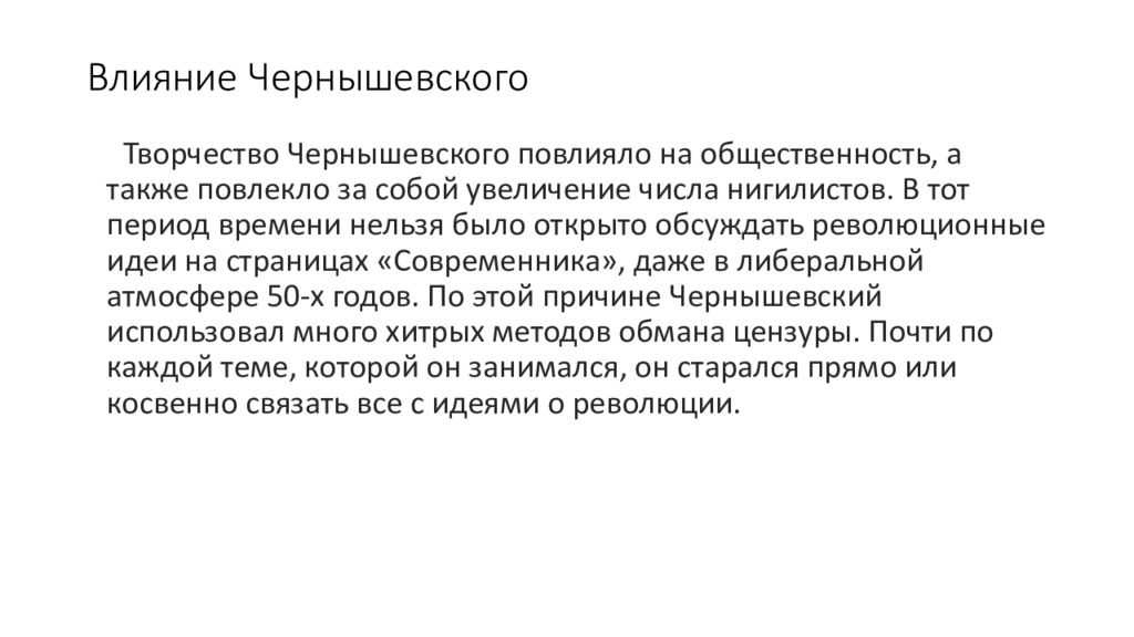 Творчество Чернышевского повлияло на общественность, а также повлекло за собой увеличение числа нигилистов. В тот период времени нельзя было открыто обсуждать революционные идеи на страницах «Современника», даже в либеральной атмосфере 50-х годов. По этой причине Чернышевский использовал много хитрых методов обмана цензуры. Почти по каждой теме, которой он занимался, он старался прямо или косвенно связать все с идеями о революции.