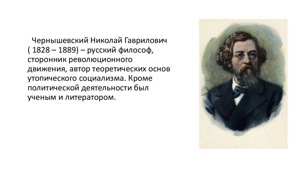 Чернышевский Николай Гаврилович ( 1828 – 1889) – русский философ, сторонник революционного движения, автор теоретических основ утопического социализма. Кроме политической деятельности был ученым и литератором.