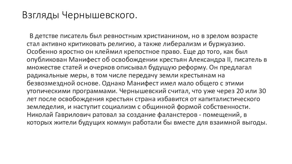 В детстве писатель был ревностным христианином, но в зрелом возрасте стал активно критиковать религию, а также либерализм и буржуазию. Особенно яростно он клеймил крепостное право. Еще до того, как был опубликован Манифест об освобождении крестьян Александра II, писатель в множестве статей и очерков описывал будущую реформу. Он предлагал радикальные меры, в том числе передачу земли крестьянам на безвозмездной основе. Однако Манифест имел мало общего с этими утопическими программами. Чернышевский считал, что уже через 20 или 30 лет после освобождения крестьян страна избавится от капиталистического земледелия, и наступит социализм с общинной формой собственности. Николай Гаврилович ратовал за создание фаланстеров - помещений, в которых жители будущих коммун работали бы вместе для взаимной выгоды.