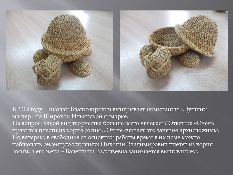 В 2015 году Николай Владимирович выигрывает номинацию «Лучший мастер» на Широкой Ильинской ярмарке. На вопрос: какой вид творчества больше всего увлекает? Ответил: «Очень нравится плести из корня сосны». Он не считает это занятие архисложным. По вечерам, в свободное от основной работы время в их доме можно наблюдать семейную идиллию: Николай Владимирович плетет из корня сосны, а его жена – Валентина Васильевна занимается вышиванием.