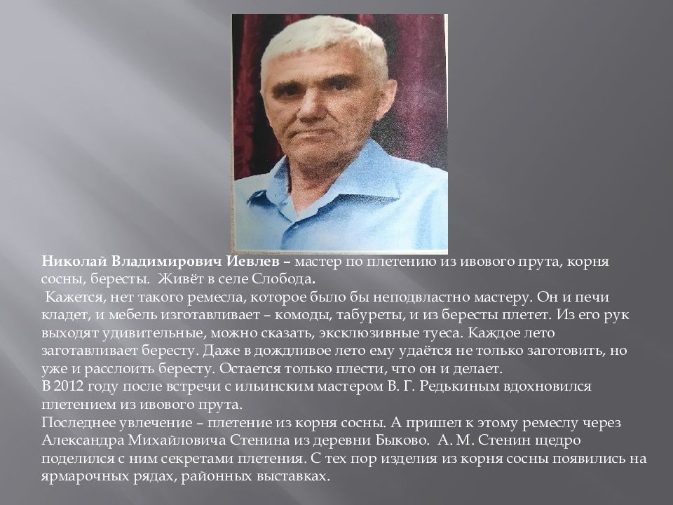 Николай Владимирович Иевлев – мастер по плетению из ивового прута, корня сосны, бересты. Живёт в селе Слобода. Кажется, нет такого ремесла, которое было бы неподвластно мастеру. Он и печи кладет, и мебель изготавливает – комоды, табуреты, и из бересты плетет. Из его рук выходят удивительные, можно сказать, эксклюзивные туеса. Каждое лето заготавливает бересту. Даже в дождливое лето ему удаётся не только заготовить, но уже и расслоить бересту. Остается только плести, что он и делает. В 2012 году после встречи с ильинским мастером В. Г. Редькиным вдохновился плетением из ивового прута. Последнее увлечение – плетение из корня сосны. А пришел к этому ремеслу через Александра Михайловича Стенина из деревни Быково. А. М. Стенин щедро поделился с ним секретами плетения. С тех пор изделия из корня сосны появились на ярмарочных рядах, районных выставках.