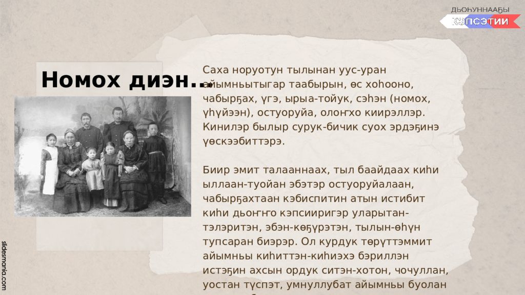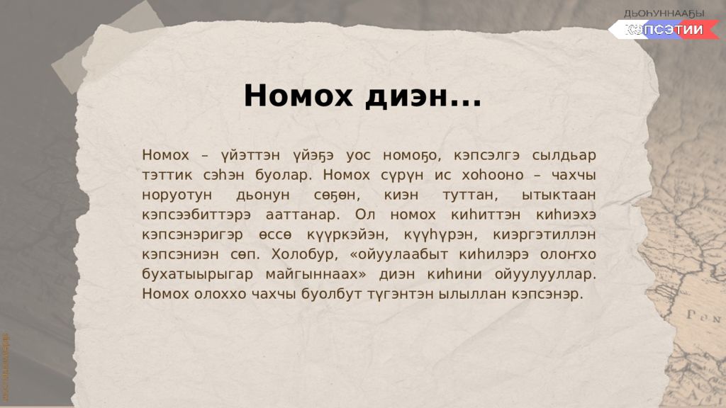 Номох – үйэттэн үйэҕэ уос номоҕо, кэпсэлгэ сылдьар тэттик сэһэн буолар. Номох сүрүн ис хоһооно – чахчы норуотун дьонун сөҕөн, киэн туттан, ытыктаан кэпсээбиттэрэ ааттанар. Ол номох киһиттэн киһиэхэ кэпсэнэригэр өссө күүркэйэн, күүһүрэн, киэргэтиллэн кэпсэниэн сөп. Холобур, « ойуулаабыт киһилэрэ олоҥхо бухатыырыгар майгыннаах » диэн киһини ойуулууллар. Номох олоххо чахчы буолбут түгэнтэн ылыллан кэпсэнэр.