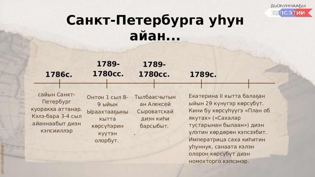 1 786с. Онтон 1 сыл 8-9 ыйын Ыраахтааҕыны кытта көрсүһэрин күүтэн олорбут. 1789-1780сс. Тылбаасчытынан Алексей Сыроватскай диэн киһи барсыбыт. . 1789-1780сс. Екатерина II кытта балаҕан ыйын 29 күнүгэр көрсүбүт. Кини бу көрсүһүүгэ «План об якутах» («Сахалар тустарынан былаан») диэн үлэтин көрдөрөн кэпсээбит. Императрица саха киһитин уһуннук, санаата кэлэн олорон көрсүбүт диэн номохторго кэпсэнэр. 1789с. сайын Санкт-Петербург куоракка аттанар. Кэлэ-бара 3-4 сыл айаннаабыт диэн кэпсииллэр