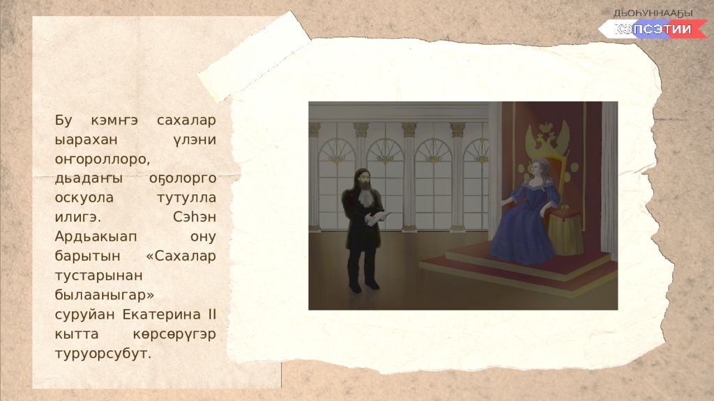 Бу кэмҥэ сахалар ыарахан үлэни оҥороллоро, дьадаҥы оҕолорго оскуола тутулла илигэ. Сэһэн Ардьакыап ону барытын «Сахалар тустарынан былааныгар» суруйан Екатерина II кытта көрсөрүгэр туруорсубут.