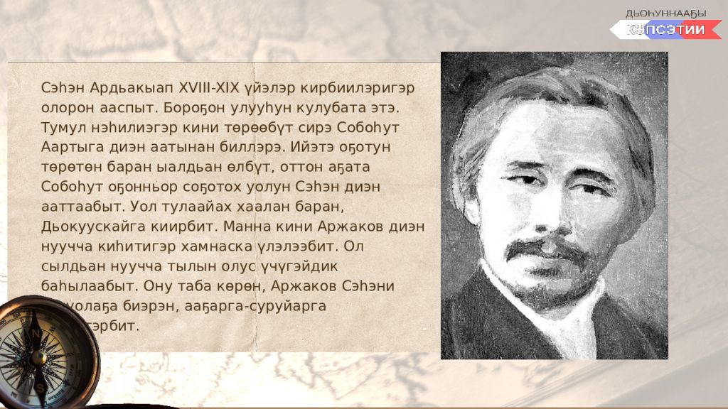 Сэһэн Ардьакыап саха норуотун историятыгар үйэлэргэ киирбит киһи. Ол кини муударай өйүн, дириҥ толкуйун, хорсун санаатын кытта ситимнээх. Сэһэн Ардьакыап диэн кимий ? 01