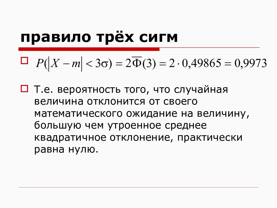 Т.е. вероятность того, что случайная величина отклонится от своего математического ожидание на величину, большую чем утроенное среднее квадратичное отклонение, практически равна нулю.
