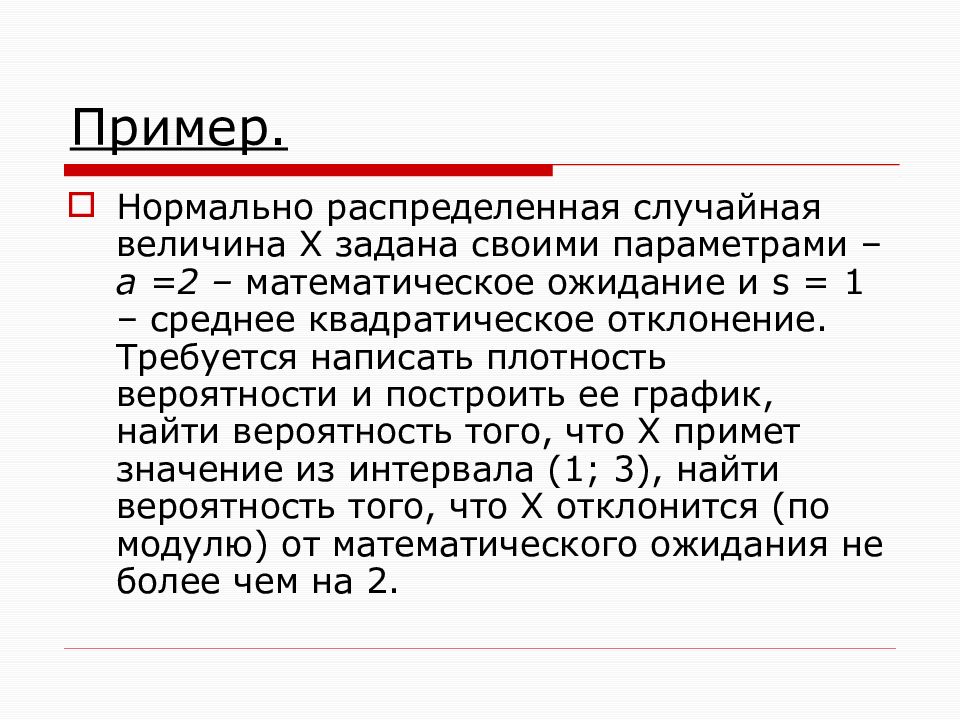 Нормально распределенная случайная величина Х задана своими параметрами – а =2 – математическое ожидание и s = 1 – среднее квадратическое отклонение. Требуется написать плотность вероятности и построить ее график, найти вероятность того, что Х примет значение из интервала (1; 3), найти вероятность того, что Х отклонится (по модулю) от математического ожидания не более чем на 2.