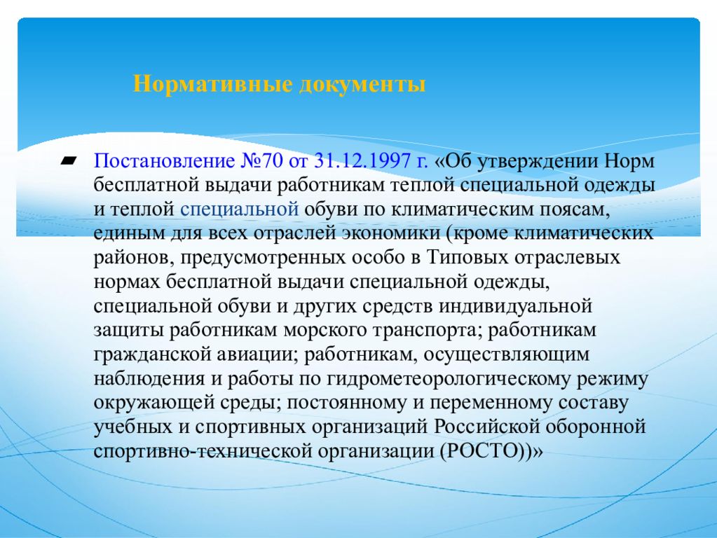 Постановление №70 от 31.12.1997 г. «Об утверждении Норм бесплатной выдачи работникам теплой специальной одежды и теплой специальной обуви по климатическим поясам, единым для всех отраслей экономики (кроме климатических районов, предусмотренных особо в Типовых отраслевых нормах бесплатной выдачи специальной одежды, специальной обуви и других средств индивидуальной защиты работникам морского транспорта; работникам гражданской авиации; работникам, осуществляющим наблюдения и работы по гидрометеорологическому режиму окружающей среды; постоянному и переменному составу учебных и спортивных организаций Российской оборонной спортивно-технической организации (РОСТО))»