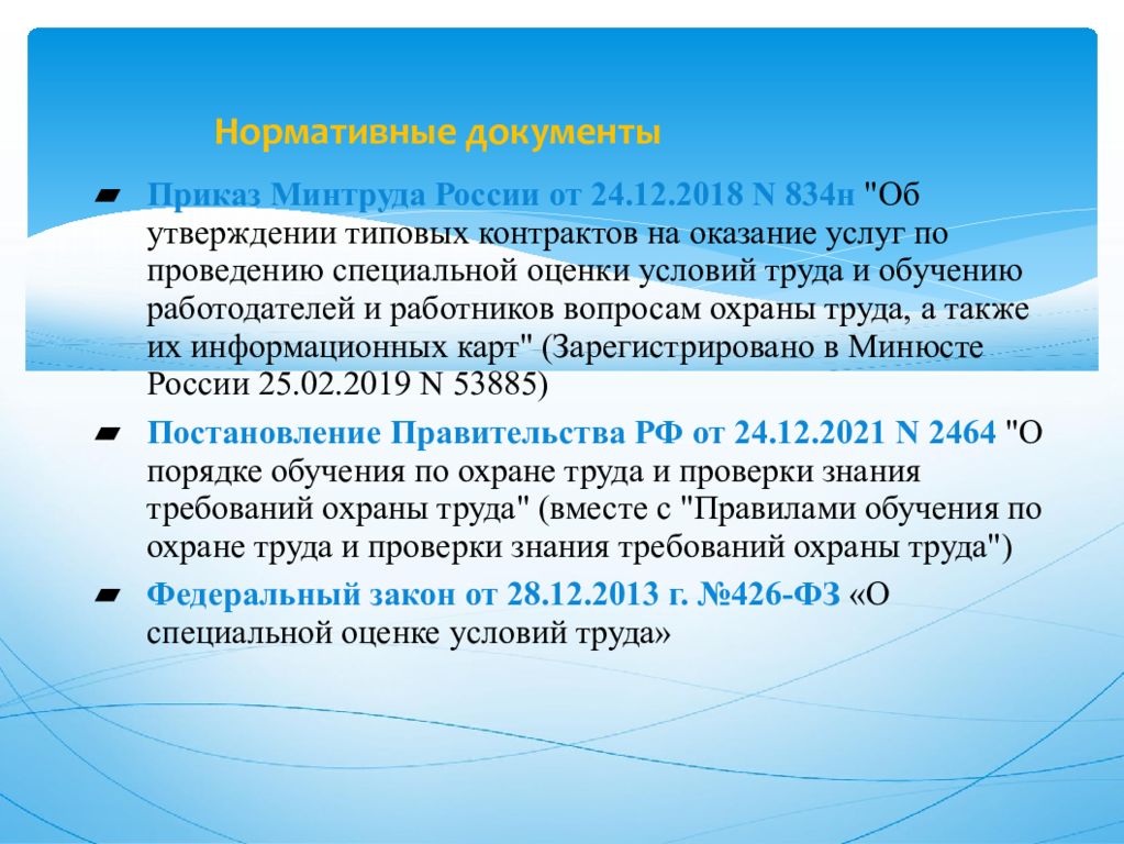 Приказ Минтруда России от 24.12.2018 N 834н "Об утверждении типовых контрактов на оказание услуг по проведению специальной оценки условий труда и обучению работодателей и работников вопросам охраны труда, а также их информационных карт" (Зарегистрировано в Минюсте России 25.02.2019 N 53885 ) Постановление Правительства РФ от 24.12.2021 N 2464 " О порядке обучения по охране труда и проверки знания требований охраны труда" (вместе с "Правилами обучения по охране труда и проверки знания требований охраны труда") Федеральный закон от 28.12.2013 г. №426-ФЗ «О специальной оценке условий труда »