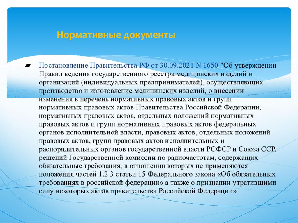 Постановление Правительства РФ от 30.09.2021 N 1650 "Об утверждении Правил ведения государственного реестра медицинских изделий и организаций (индивидуальных предпринимателей), осуществляющих производство и изготовление медицинских изделий, о внесении изменения в перечень нормативных правовых актов и групп нормативных правовых актов Правительства Российской Федерации, нормативных правовых актов, отдельных положений нормативных правовых актов и групп нормативных правовых актов федеральных органов исполнительной власти, правовых актов, отдельных положений правовых актов, групп правовых актов исполнительных и распорядительных органов государственной власти РСФСР и Союза ССР, решений Государственной комиссии по радиочастотам, содержащих обязательные требования, в отношении которых не применяются положения частей 1,2 3 статьи 15 Федерального закона «Об обязательных требованиях в российской федерации» а также о признании утратившими силу некоторых актов правительства Российской Федерации»