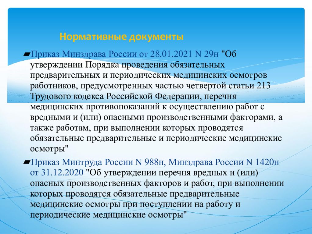Приказ Минздрава России от 28.01.2021 N 29н "Об утверждении Порядка проведения обязательных предварительных и периодических медицинских осмотров работников, предусмотренных частью четвертой статьи 213 Трудового кодекса Российской Федерации, перечня медицинских противопоказаний к осуществлению работ с вредными и (или) опасными производственными факторами, а также работам, при выполнении которых проводятся обязательные предварительные и периодические медицинские осмотры" Приказ Минтруда России N 988н, Минздрава России N 1420н от 31.12.2020 "Об утверждении перечня вредных и (или) опасных производственных факторов и работ, при выполнении которых проводятся обязательные предварительные медицинские осмотры при поступлении на работу и периодические медицинские осмотры"