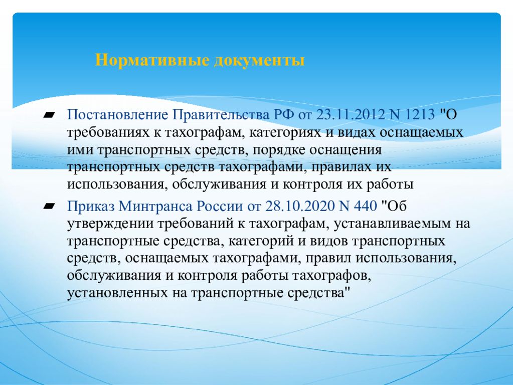 Постановление Правительства РФ от 23.11.2012 N 1213 "О требованиях к тахографам, категориях и видах оснащаемых ими транспортных средств, порядке оснащения транспортных средств тахографами, правилах их использования, обслуживания и контроля их работы Приказ Минтранса России от 28.10.2020 N 440 "Об утверждении требований к тахографам, устанавливаемым на транспортные средства, категорий и видов транспортных средств, оснащаемых тахографами, правил использования, обслуживания и контроля работы тахографов, установленных на транспортные средства"