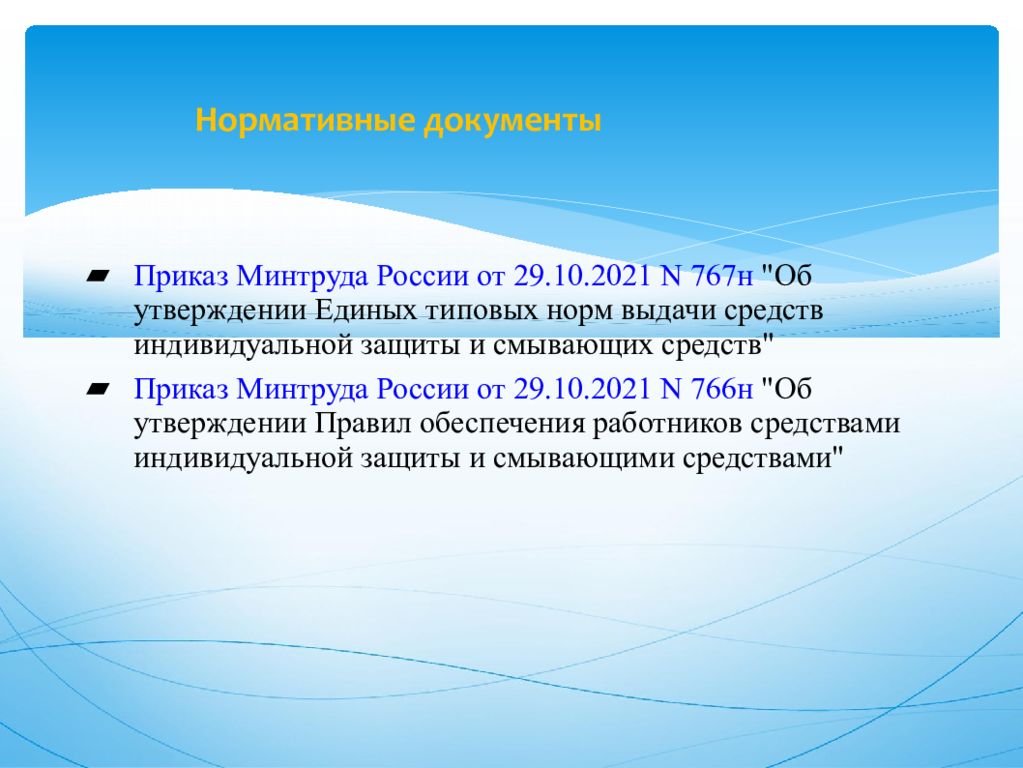 Приказ Минтруда России от 29.10.2021 N 767н "Об утверждении Единых типовых норм выдачи средств индивидуальной защиты и смывающих средств" Приказ Минтруда России от 29.10.2021 N 766н "Об утверждении Правил обеспечения работников средствами индивидуальной защиты и смывающими средствами"