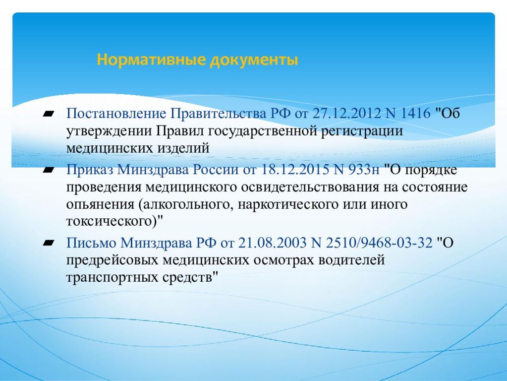 Постановление Правительства РФ от 27.12.2012 N 1416 "Об утверждении Правил государственной регистрации медицинских изделий Приказ Минздрава России от 18.12.2015 N 933н "О порядке проведения медицинского освидетельствования на состояние опьянения (алкогольного, наркотического или иного токсического)" Письмо Минздрава РФ от 21.08.2003 N 2510/9468-03-32 "О предрейсовых медицинских осмотрах водителей транспортных средств"
