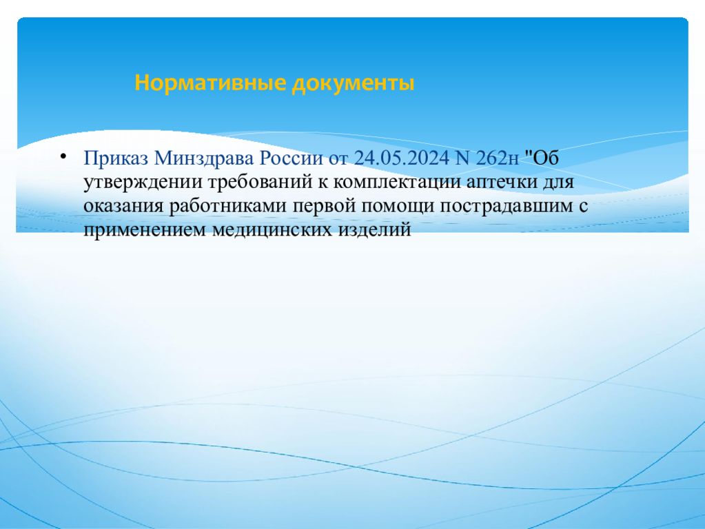 Приказ Минздрава России от 24.05.2024 N 262н "Об утверждении требований к комплектации аптечки для оказания работниками первой помощи пострадавшим с применением медицинских изделий