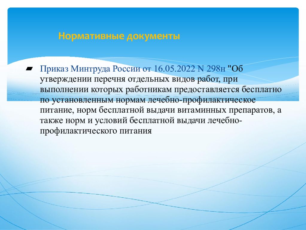 Приказ Минтруда России от 16.05.2022 N 298н "Об утверждении перечня отдельных видов работ, при выполнении которых работникам предоставляется бесплатно по установленным нормам лечебно-профилактическое питание, норм бесплатной выдачи витаминных препаратов, а также норм и условий бесплатной выдачи лечебно-профилактического питания