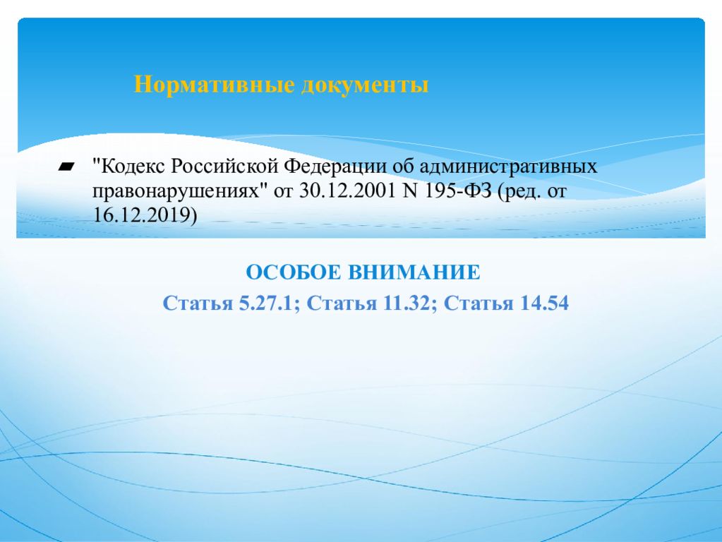 "Кодекс Российской Федерации об административных правонарушениях" от 30.12.2001 N 195-ФЗ (ред. от 16.12.2019 ) ОСОБОЕ ВНИМАНИЕ Статья 5.27.1; Статья 11.32; Статья 14.54