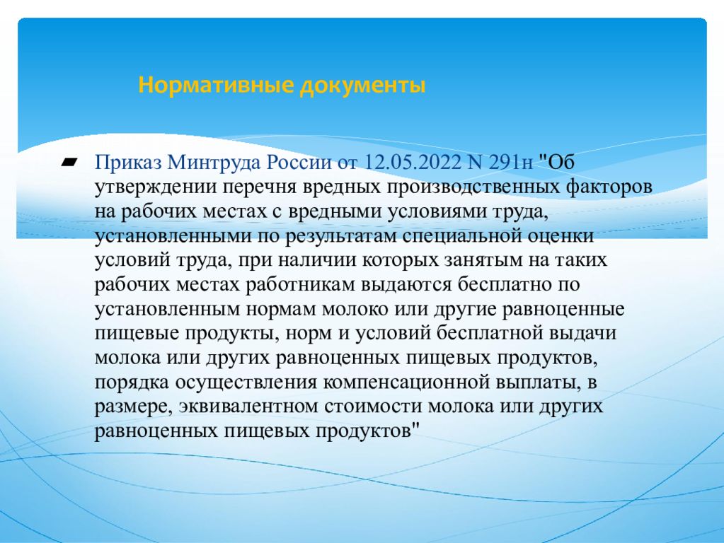 Приказ Минтруда России от 12.05.2022 N 291н "Об утверждении перечня вредных производственных факторов на рабочих местах с вредными условиями труда, установленными по результатам специальной оценки условий труда, при наличии которых занятым на таких рабочих местах работникам выдаются бесплатно по установленным нормам молоко или другие равноценные пищевые продукты, норм и условий бесплатной выдачи молока или других равноценных пищевых продуктов, порядка осуществления компенсационной выплаты, в размере, эквивалентном стоимости молока или других равноценных пищевых продуктов"