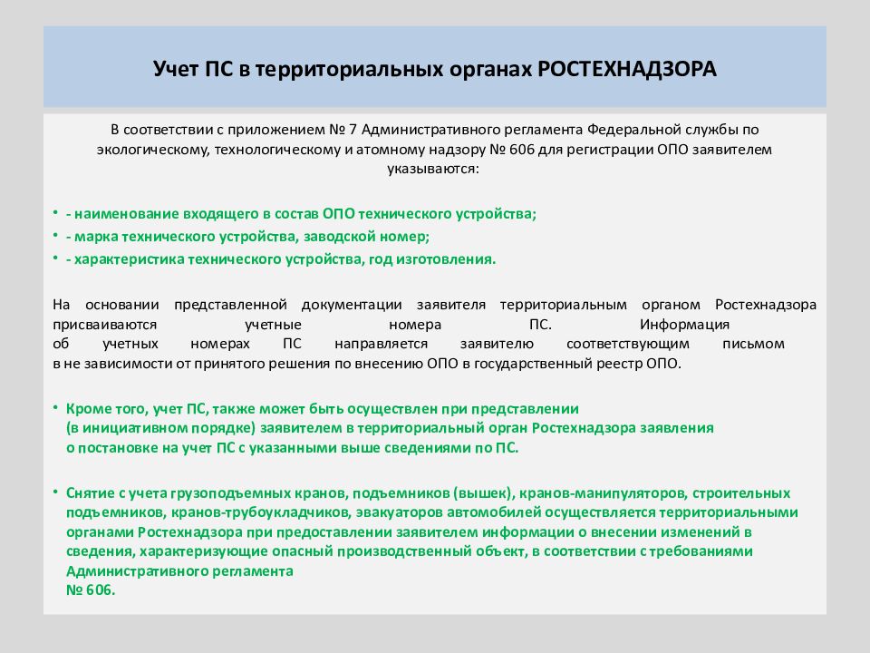 В соответствии с приложением № 7 Административного регламента Федеральной службы по экологическому, технологическому и атомному надзору № 606 для регистрации ОПО заявителем указываются : - наименование входящего в состав ОПО технического устройства; - марка технического устройства, заводской номер; - характеристика технического устройства, год изготовления. На основании представленной документации заявителя территориальным органом Ростехнадзора присваиваются учетные номера ПС. Информация об учетных номерах ПС направляется заявителю соответствующим письмом в не зависимости от принятого решения по внесению ОПО в государственный реестр ОПО. Кроме того, учет ПС, также может быть осуществлен при представлении (в инициативном порядке) заявителем в территориальный орган Ростехнадзора заявления о постановке на учет ПС с указанными выше сведениями по ПС. Снятие с учета грузоподъемных кранов, подъемников (вышек), кранов-манипуляторов, строительных подъемников, кранов-трубоукладчиков, эвакуаторов автомобилей осуществляется территориальными органами Ростехнадзора при предоставлении заявителем информации о внесении изменений в сведения, характеризующие опасный производственный объект, в соответствии с требованиями Административного регламента № 606.