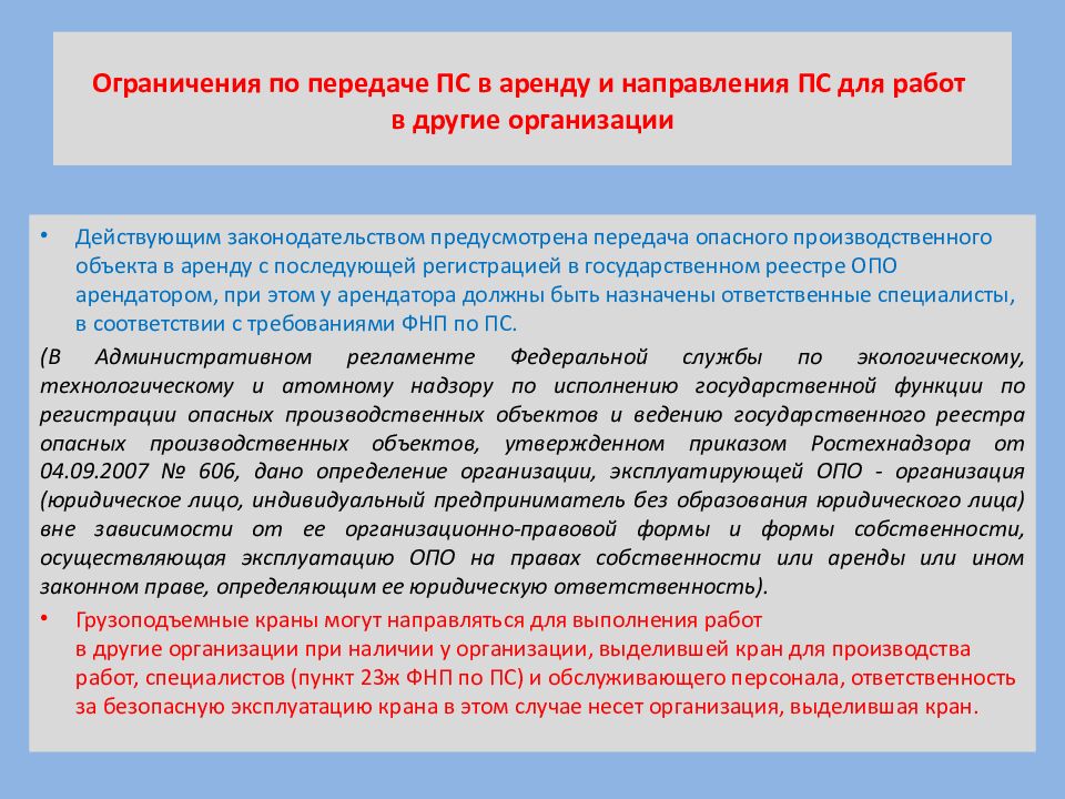 Действующим законодательством предусмотрена передача опасного производственного объекта в аренду с последующей регистрацией в государственном реестре ОПО арендатором, при этом у арендатора должны быть назначены ответственные специалисты, в соответствии с требованиями ФНП по ПС. (В Административном регламенте Федеральной службы по экологическому, технологическому и атомному надзору по исполнению государственной функции по регистрации опасных производственных объектов и ведению государственного реестра опасных производственных объектов, утвержденном приказом Ростехнадзора от 04.09.2007 № 606, дано определение организации, эксплуатирующей ОПО - организация (юридическое лицо, индивидуальный предприниматель без образования юридического лица) вне зависимости от ее организационно-правовой формы и формы собственности, осуществляющая эксплуатацию ОПО на правах собственности или аренды или ином законном праве, определяющим ее юридическую ответственность). Грузоподъемные краны могут направляться для выполнения работ в другие организации при наличии у организации, выделившей кран для производства работ, специалистов (пункт 23ж ФНП по ПС) и обслуживающего персонала, ответственность за безопасную эксплуатацию крана в этом случае несет организация, выделившая кран.