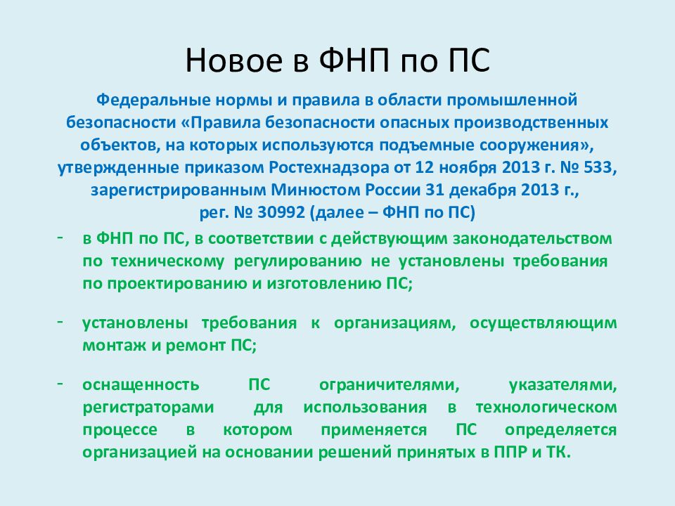 Федеральные нормы и правила в области промышленной безопасности «Правила безопасности опасных производственных объектов, на которых используются подъемные сооружения», утвержденные приказом Ростехнадзора от 12 ноября 2013 г. № 533, зарегистрированным Минюстом России 31 декабря 2013 г., рег. № 30992 (далее – ФНП по ПС ) в ФНП по ПС, в соответствии с действующим законодательством по техническому регулированию не установлены требования по проектированию и изготовлению ПС; у становлены требования к организациям, осуществляющим монтаж и ремонт ПС; оснащенность ПС ограничителями, указателями, регистраторами для использования в технологическом процессе в котором применяется ПС определяется организацией на основании решений принятых в ППР и ТК.