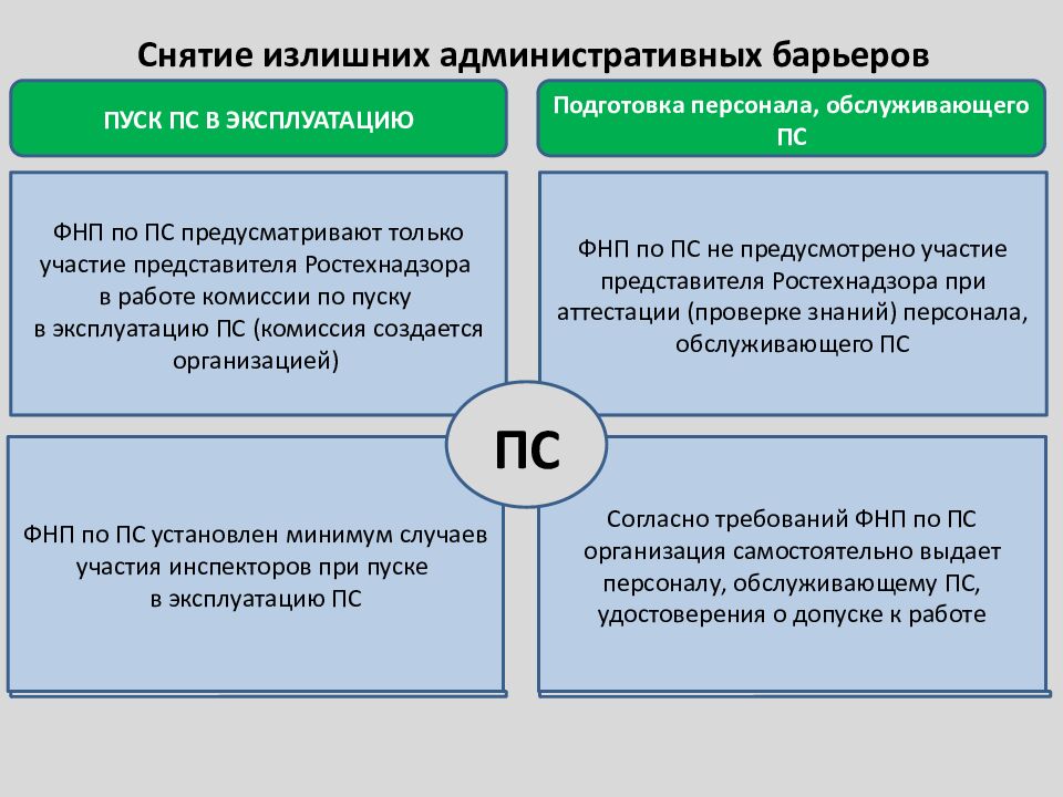 ФНП по ПС предусматривают только участие представителя Ростехнадзора в работе комиссии по пуску в эксплуатацию ПС (комиссия создается организацией) ПУСК ПС В ЭКСПЛУАТАЦИЮ Подготовка персонала, обслуживающего ПС Снятие излишних административных барьеров ФНП по ПС установлен минимум случаев участия инспекторов при пуске в эксплуатацию ПС ФНП по ПС не предусмотрено участие представителя Ростехнадзора при аттестации (проверке знаний) персонала, обслуживающего ПС Согласно требований ФНП по ПС организация самостоятельно выдает персоналу, обслуживающему ПС, удостоверения о допуске к работе ПС