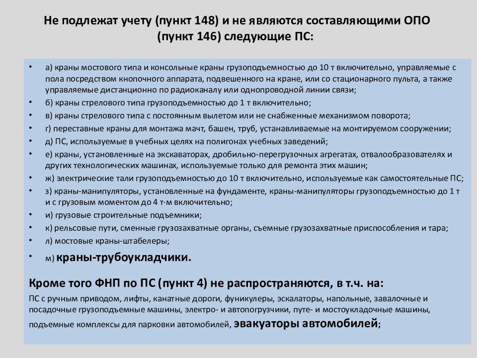 а) краны мостового типа и консольные краны грузоподъемностью до 10 т включительно, управляемые с пола посредством кнопочного аппарата, подвешенного на кране, или со стационарного пульта, а также управляемые дистанционно по радиоканалу или однопроводной линии связи; б) краны стрелового типа грузоподъемностью до 1 т включительно; в) краны стрелового типа с постоянным вылетом или не снабженные механизмом поворота; г) переставные краны для монтажа мачт, башен, труб, устанавливаемые на монтируемом сооружении; д) ПС, используемые в учебных целях на полигонах учебных заведений; е) краны, установленные на экскаваторах, дробильно-перегрузочных агрегатах, отвалообразователях и других технологических машинах, используемые только для ремонта этих машин; ж) электрические тали грузоподъемностью до 10 т включительно, используемые как самостоятельные ПС; з) краны-манипуляторы, установленные на фундаменте, краны-манипуляторы грузоподъемностью до 1 т и с грузовым моментом до 4 т·м включительно; и) грузовые строительные подъемники; к) рельсовые пути, сменные грузозахватные органы, съемные грузозахватные приспособления и тара; л) мостовые краны-штабелеры; м) краны-трубоукладчики. Кроме того ФНП по ПС (пункт 4) не распространяются, в т.ч. на: ПС с ручным приводом, лифты, канатные дороги, фуникулеры, эскалаторы, напольные, завалочные и посадочные грузоподъемные машины, электро- и автопогрузчики, путе - и мостоукладочные машины, подъемные комплексы для парковки автомобилей, эвакуаторы автомобилей ;