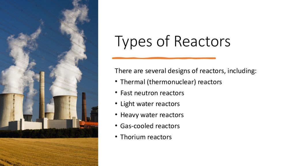 There are several designs of reactors, including: Thermal (thermonuclear) reactors Fast neutron reactors Light water reactors Heavy water reactors Gas-cooled reactors Thorium reactors