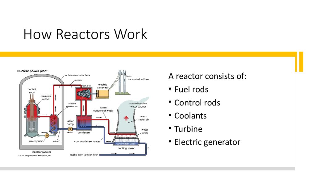 A reactor consists of: Fuel rods Control rods Coolants Turbine Electric generator