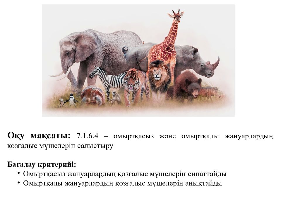 Оқу мақсаты: 7.1.6.4 – омыртқасыз және омыртқалы жануарлардың қозғалыс мүшелерін салыстыру Бағалау критерийі: Омыртқасыз жануарлардың қозғалыс мүшелерін сипаттайды Омыртқалы жануарлардың қозғалыс мүшелерін анықтайды