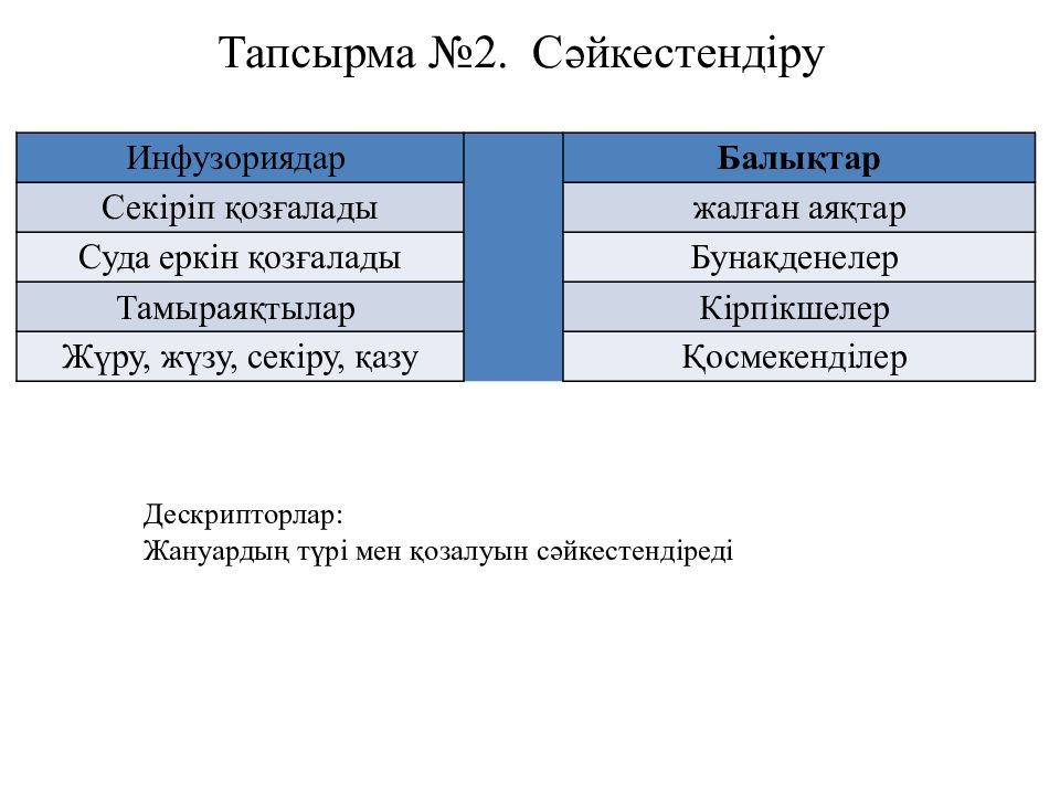 Инфузориядар Балықтар Секіріп қозғалады жалған аяқтар Суда еркін қозғалады Бунақденелер Тамыраяқтылар Кірпікшелер Жүру, жүзу, секіру, қазу Қосмекенділер Тапсырма №2. Сәйкестендіру Дескрипторлар: Жануардың түрі мен қозалуын сәйкестендіреді